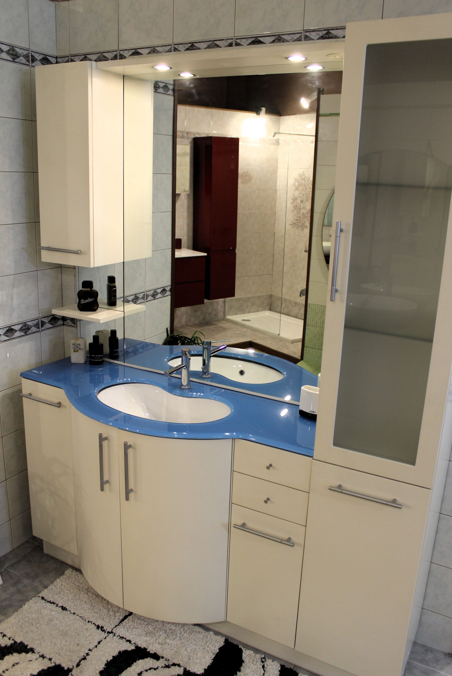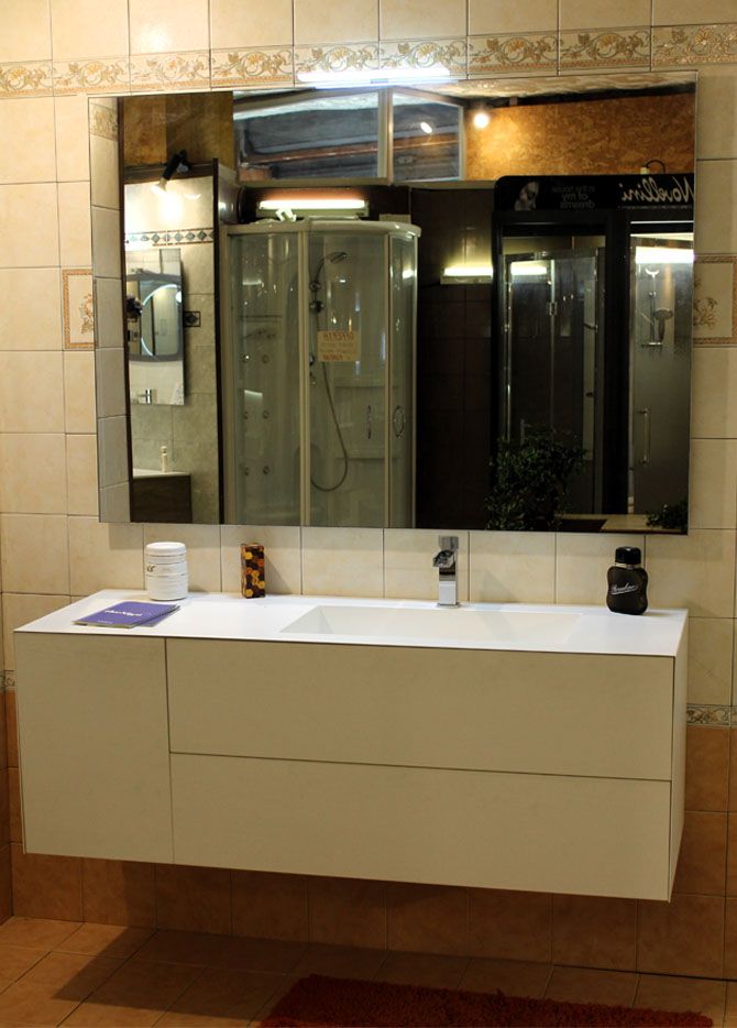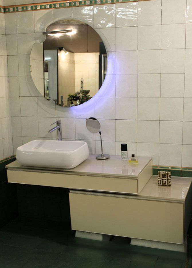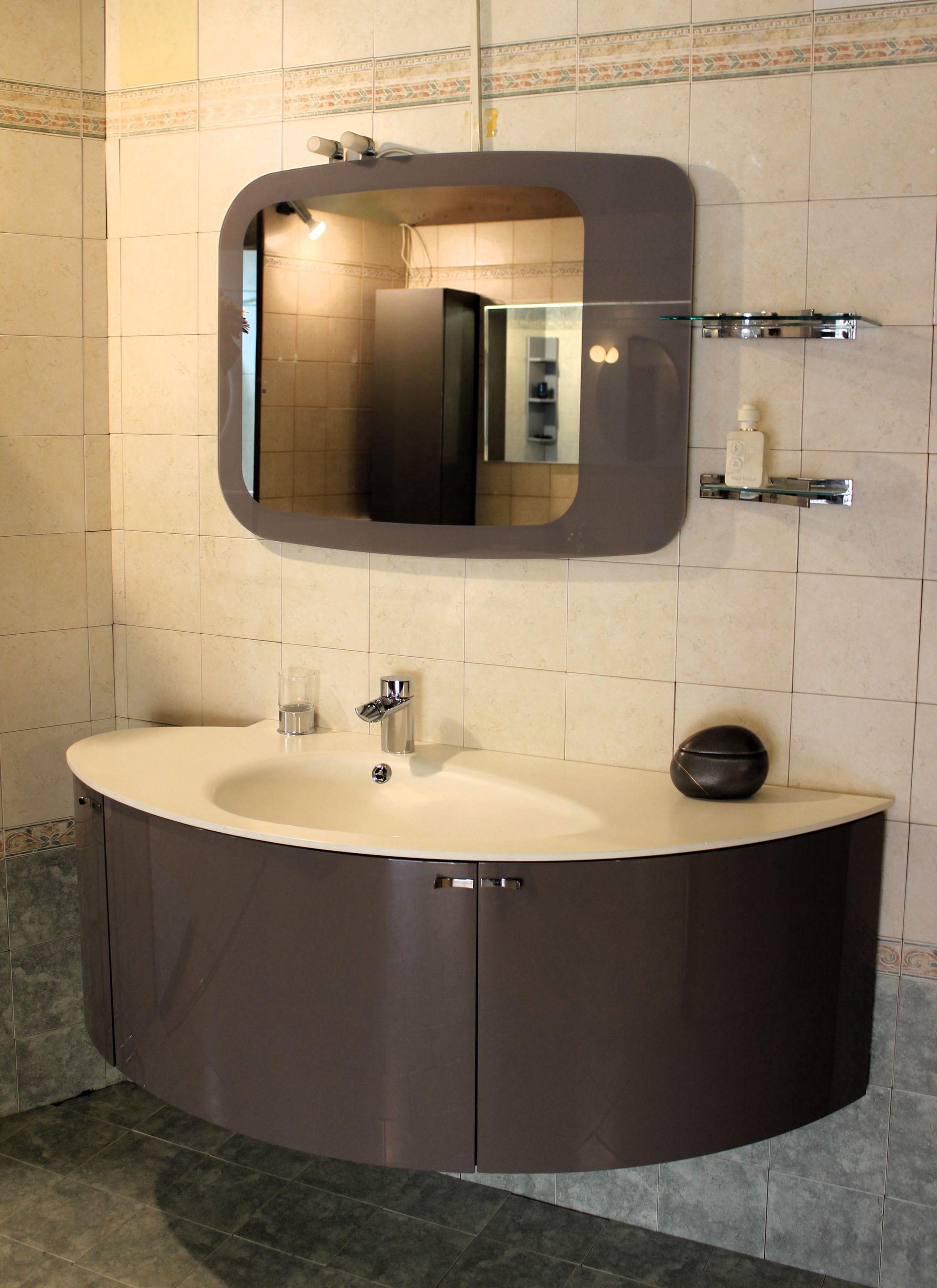 Piano stondato con ante colore tortora lucido. Completo di specchio con luce con interruttore touch.