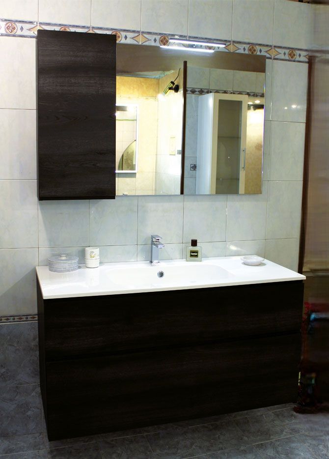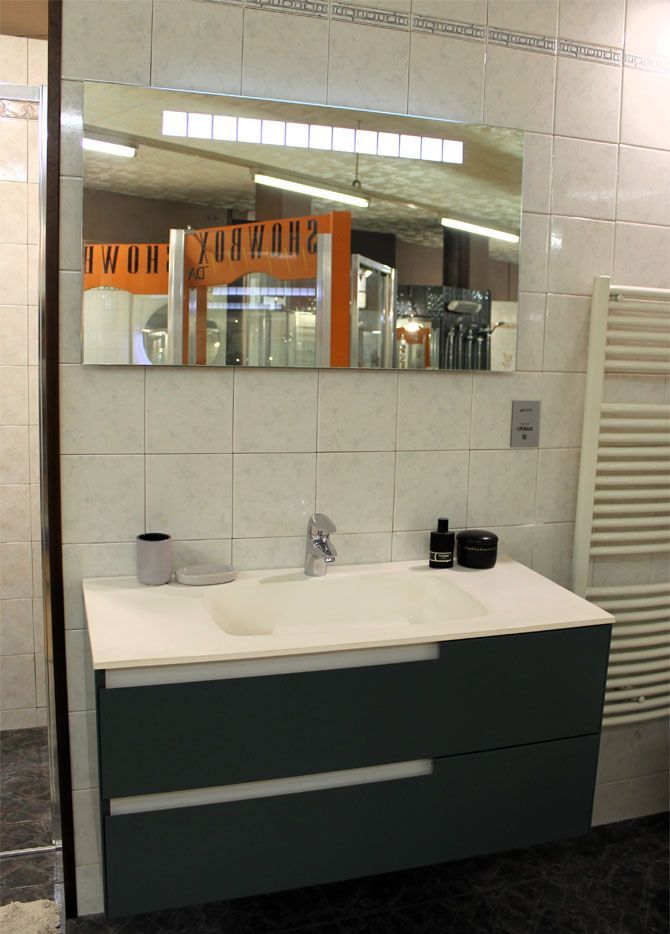 Con 2 cassettoni color grafite. Completo di specchio con luce e pensile.
