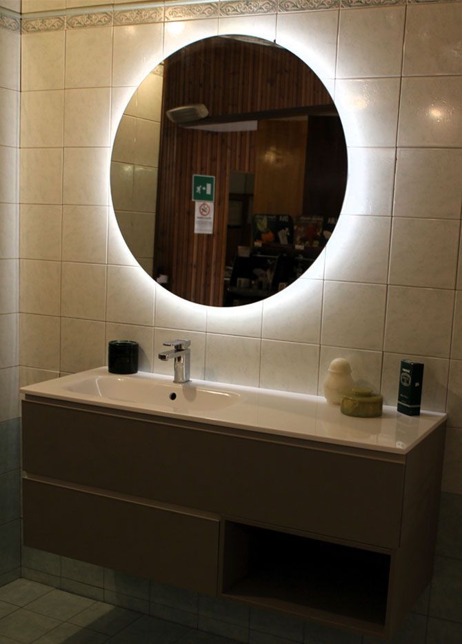 In melaminico color visone con 2 cassettoni. Completo di specchio tondo retroilluminato.