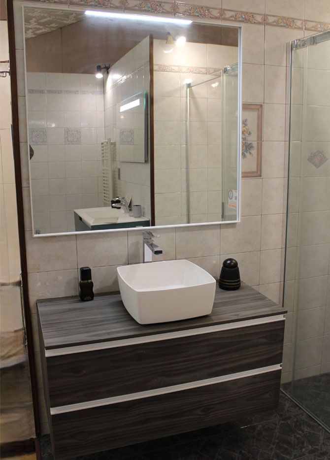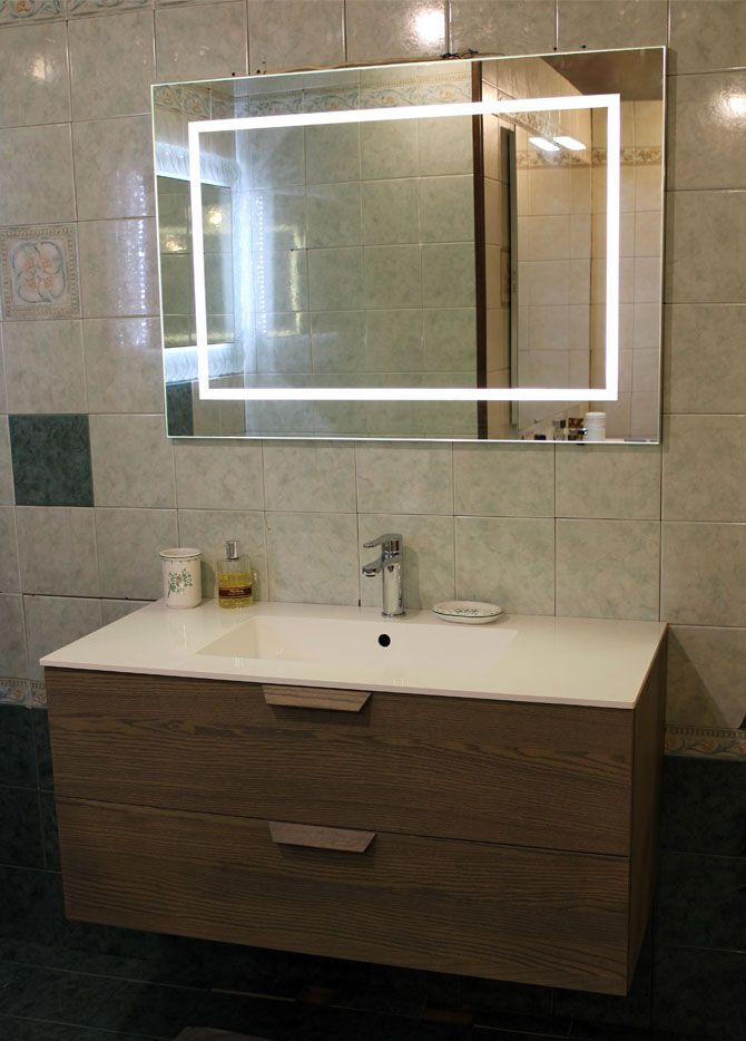 Con 2 cassettoni. Lavabo a bacinella quadrata. Specchio con luce a led.