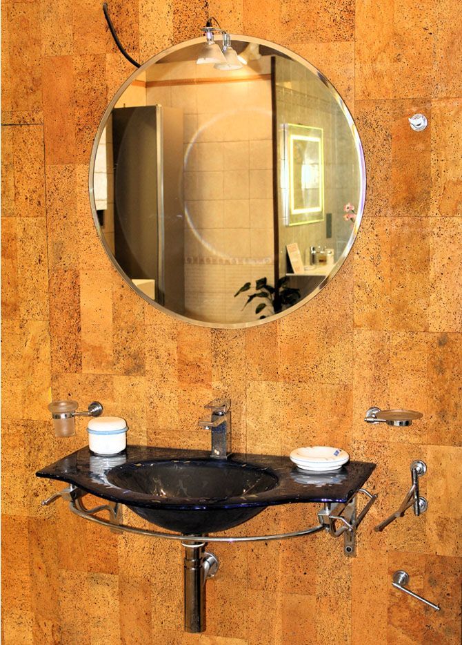 Con piano lavabo a consolle in cristallo azzurro da cm. 85. Completo di specchio tondo con luce.