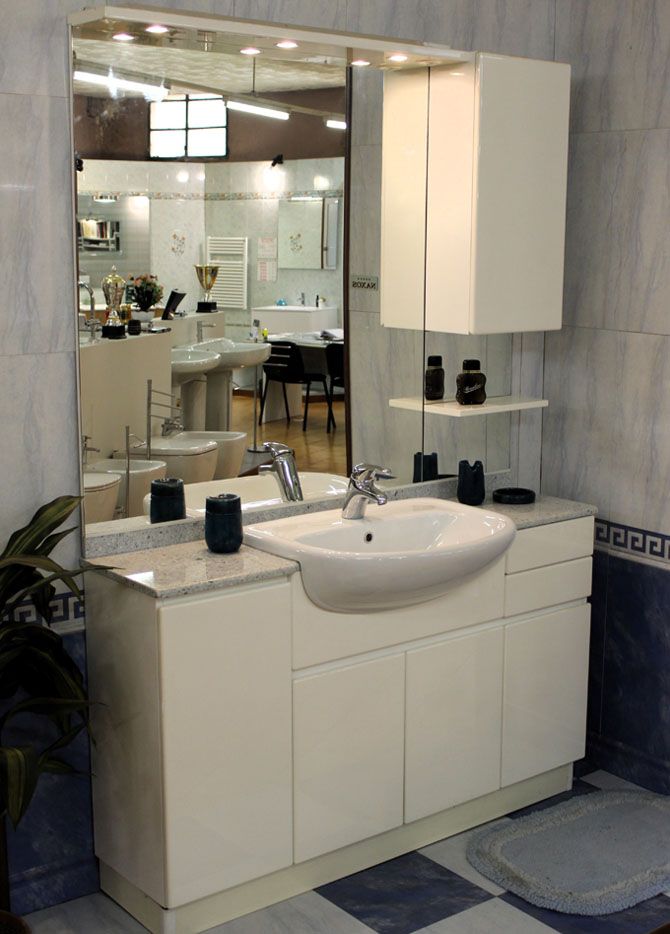 Colore bianco lucido. Lavabo a semincasso con top in marmo tecnico azzurro. Completo di specchio con luce a pensile.