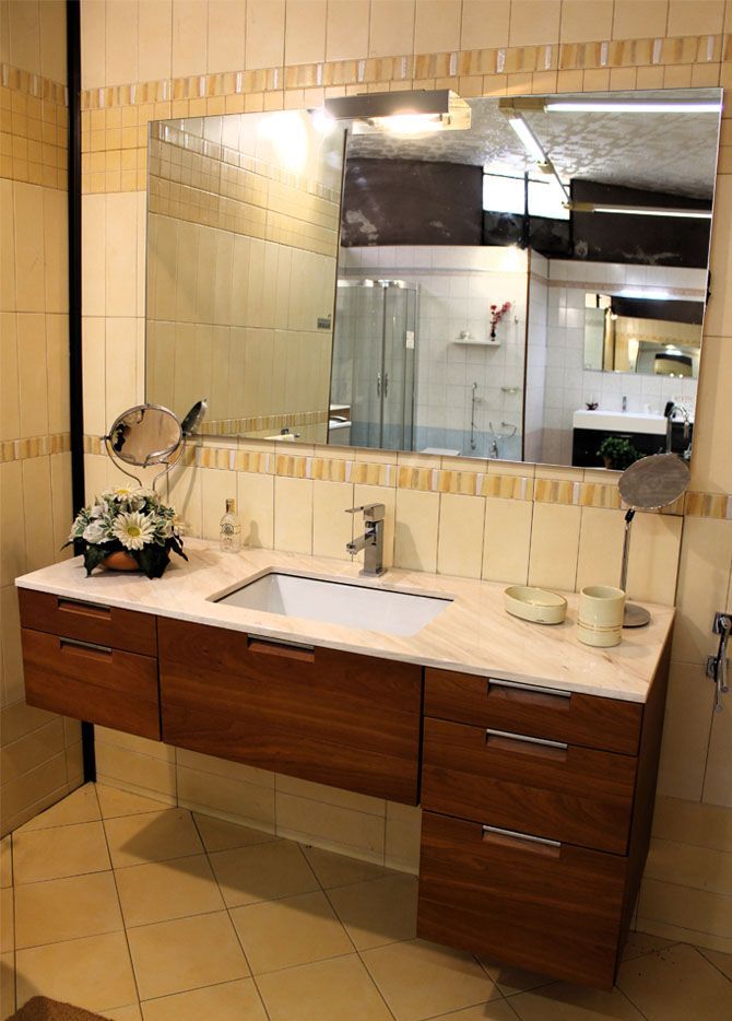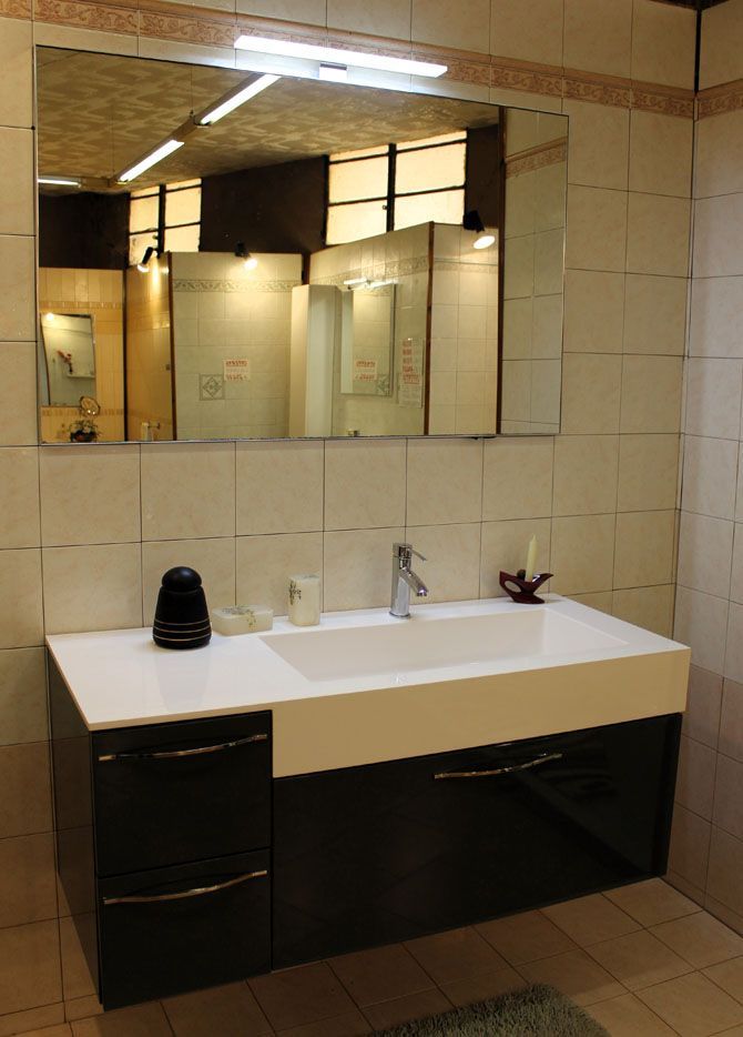 Con 2 cassettoni sospesi color beige. Top in cristallo con lavabo a bacinella. Completo di specchio tondo con luce.